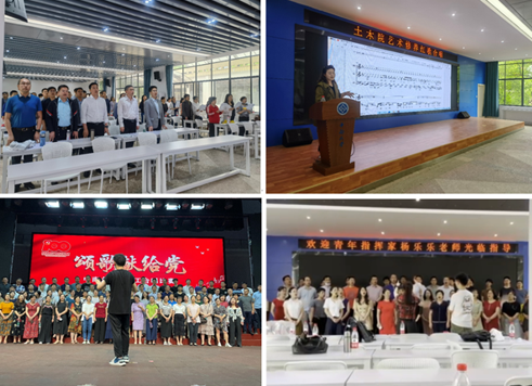 土木工程学院党委及学院部门工会高度重视本次合唱。自筹建本次“颂歌献给党”合唱团至合唱比赛落下帷幕,各相关工作统筹安排,不断推进。院党政领导班子成员、工会干部和系所干部带头,教职工争先参与,最后在300多教职工中选拔出90多名老师参加组成合唱团。赛前每周保证训练2-3次,或下午或晚上或周末。从发声练习、气息保持、声部韵律、感情表达等合唱技巧到与指挥、乐队的精巧配合等从严要求,苦练巧练,不断提高合唱质量。由音乐表演专业毕业的学院辅导员刘昕老师全程指导协调,特邀tapplay官网交响乐团前任团长首席、土木工程学院2019级硕士研究生曾昊凡担任合唱团指挥兼教练,赛前练唱期间还邀请中国合唱协会理事、青年指挥家杨乐乐到场指导合唱,邀请湖南交通广播电台主持人吴瑾到场指导朗诵。。在1个多月的排练里,合唱团成员不辞辛劳,克服了很多困难,牺牲了大量休息时间,有的甚至出差期间还带上歌谱刻苦练唱。合唱团老师们所付出的汗水取得了应有的收获。