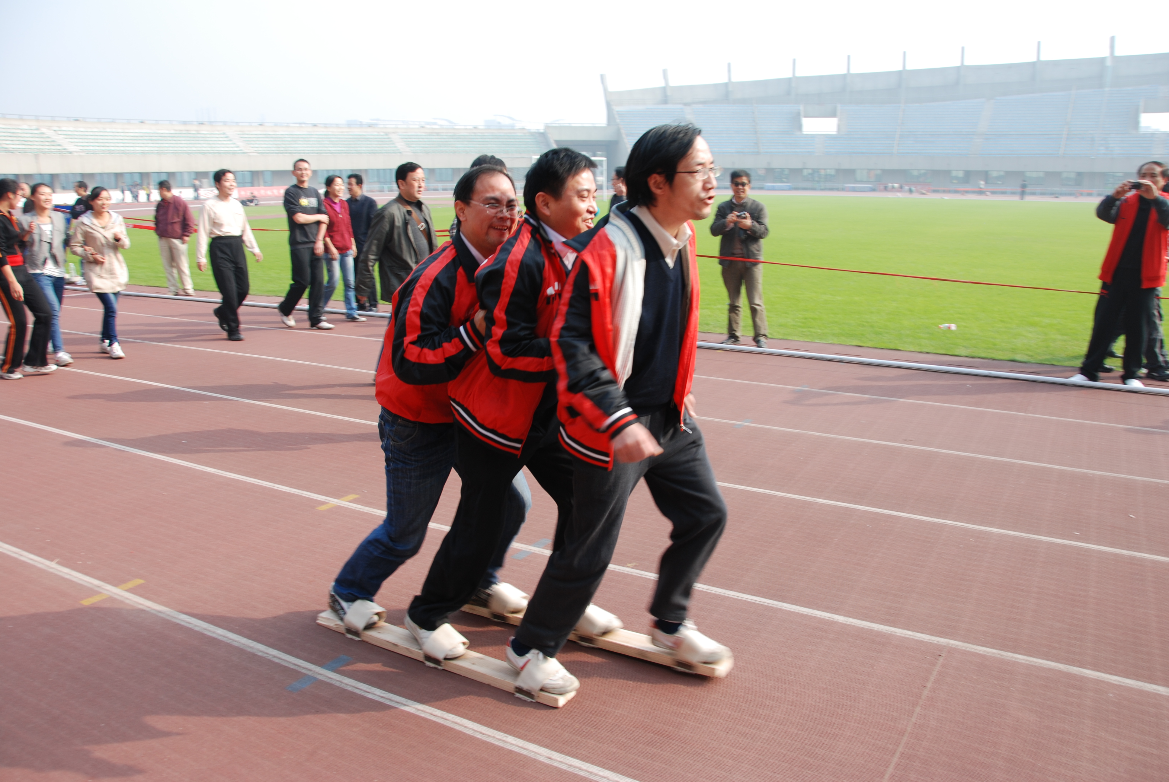 穿上板鞋的老师们以自己独有的姿态享受着这个新增项目带来的乐趣。三位穿上板鞋的男老师不管外面啦啦队心急如焚,巴掌拍烂,我自闲庭信步、悠然自得。而他们旁边三位娇小的女老师却箭步如飞、意气风发,令场外观众拍手狂呼。又开过来一队,口号很响,块头很大,气势很足,如重型坦克般稳步推进,至于速度嘛……仿佛不是他们考虑的问题,只要能顺利到达终点就是胜利就是快乐。