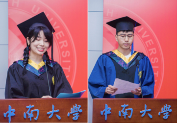 紧接着,毕业生代表进行发言。研究生代表张英杰对学院的培养表达了由衷的感谢,他对过去的研究生生活进行了回顾,表达了对学院和导师的万千感激,他表示“将带着这份感激继续前行”。2017级本科生代表吴慧萍表示在未来的日子里定会“不忘初心担使命,砥砺前行勇作为”。