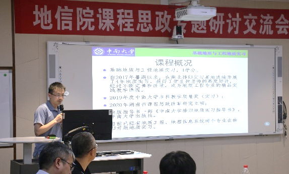 接下来,各系系主任、教学主任上台做专题发言,介绍各系课程思政工作开展的情况,应用地球物理系的崔益安、测绘与遥感科学系的张云生、地质工程系的孙平贺、地理信息系的陈杰以及地质资源系的李群五位老师依次上台发言。从理论课、实验课、实习实践以及课外与学生的交流等不同方面分享了开展课程思政工作的先进经验。