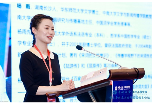 特邀嘉宾杨雨教授作了“最美的旅行——从桥开始”的主题报告。她从引起她重要关注的两座桥(现实中的赵州桥和文学艺术经典中的廊桥)出发,指出桥梁被赋予的哲学内涵是“度人利人”,即通过沟通往来开启智慧以达到利民利天下的目的;此外,桥梁作为相对静止固定的建筑实体,与不居的水流、人流形成了静与动的矛盾对立统一关系,进而指出人生亦是如此,对信仰与初心的坚守是不变的,而具体的人和事则在不断的变化与创新中。