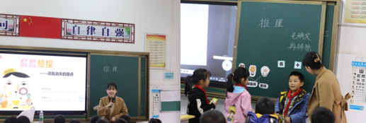 周钦璇老师执教的绘本课《推理》拉开了活动的序幕。上课前,周老师和二年级一班孩子们进行了互动,让孩子们推测礼物在哪边口袋,引导孩子们打开推理的思维,开启“侦探”之旅。在随后的课堂中,周老师引领孩子们帮助“屁屁侦探”先找到案件的委托人,再找出让甜点消失的嫌疑人,根据给出的线索,一步步推理,在整个推理的过程中,周老师重过程轻结果,“逼”着孩子们想办法用简洁的数学语言表达出推理的过程,孩子们也乐在其中,真正地进入深度思考,最后得出推理方法,要想准确推理出结果,要根据线索先找确定的,再排除不可能的。