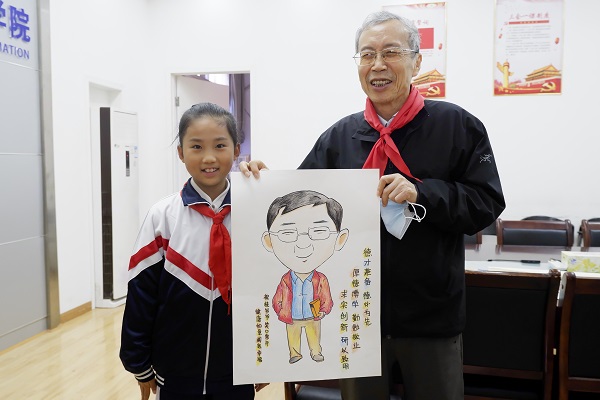 “桂爷爷,您看,这是我按照您的照片画的肖像画,送给您。”五(2)中队熊悦伊说,“我还设计、绘制了打败新冠病毒的智能机器人。”