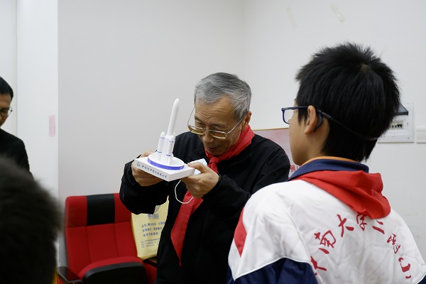 六(2)中队的常鸣轩带来了自己设计、打印的三D模型,向桂爷爷请教。