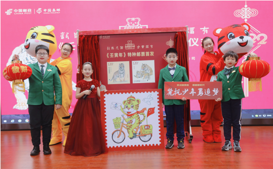 首发式现场,麓枫少年邮局王夕月、杨壹之扮成可爱的“萌虎”为大家送上新年的祝福,胡瑾瑜、雷凯宁激情解说了虎年生肖邮票,赵珩博、石宇轩介绍了新年纪念封和邮戳。长沙邮政分公司副总经理古建明、长沙邮政分公司集邮与文化传媒部经理钱昕、长沙集邮沙龙彭岳清老师、麓枫少年邮局陈中云老师为《壬寅年生肖邮票》揭幕。