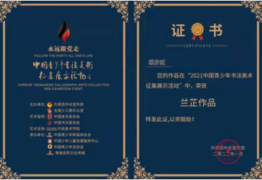 2021年10月,由共青团中央宣传部、全国少工委办公室联合主办的“永远跟党走”2021中国青少年书法美术征集展示活动如期举行,收到来自五湖四海的有效报名作品共160426幅,经过书画专家的遴选,最终仅有39860幅书画作品入围,最后评选出“青梅作(一类)品”260幅、“兰芷(二类)作品”1600幅、“墨兰(三类)作品”8000幅、“金菊(优秀)作品”30000幅。其中,粉冶院高温结构材料研究所第一党支部谭彦妮同志的油画作品《中国之翼》在众多参赛作品中脱颖而出,荣获 “兰芷作品”。