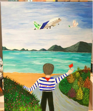 谭彦妮同志的画作灵感来源便是出于此,她说,身为中南粉冶人,为大飞机的中南元素感到由衷的自豪。油画作品主要由三部分组成,蔚蓝的天空、青翠的山峰、广阔的江河泛起碧波、花草相间摇曳风姿作为背景,描绘的是祖国的“绿水青山”;国产大型客机直冲云霄,而天空近处飞来一只衔着橄榄枝的白鸽,象征着中国航空事业的腾飞与世界和平;戴着红领巾的小男孩手中举着五星红旗,蓝色条纹的衬衫上写着“我爱中国”,表达了对祖国的无限热爱和对未来充满希望。