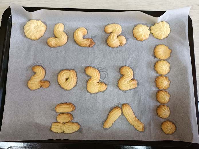 老师们在制作中互相沟通交流,大家脸上洋溢着笑容,在一片热闹喜悦的氛围中,烘焙的制作也变得更加得心应手,曲奇馅料在大家的巧手下,变成了数字、字母、花朵......各种形状的饼干。