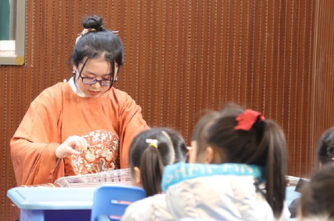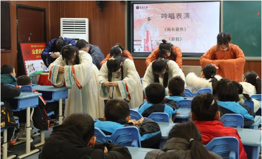 鼓乐声声,琴声铮铮,吟唱团的哥哥姐姐们表演了《南有嘉鱼》和《蓼莪》两篇经典曲目的吟唱。吟唱曲调和美,余音绕梁。台上倾情投入,台下鸦雀无声,《诗经·小雅·南有嘉鱼》以鱼水之情喻宾主尽欢其乐融融,恰如此时团员和孩子们在诗词吟唱中教学相长。