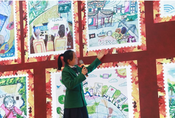 在“跟着邮票去旅行”邮票设计中,同学们用画笔描绘了创意十足的邮学画面, 其中十张作品入选“麓枫六周年明信片”。 现场,陈婵雅同学向大家解说。