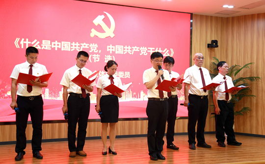 设计院全体支部委员朗诵《什么是中国共产党,中国共产党干什么》,把党日活动气氛推向了高潮,台下听众聚精会神,不由被带入党的奋斗历史里,跟着朗诵者回望党的奋斗征程。