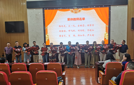 会上,阳华副院长宣读了2022退休教师和2021-2022年新入职教师名单。罗永忠书记、刘又年院长走上台,为退休教师颁发纪念章和鲜花,感谢他们多年为学院的付出,并给新入职教师一一发放纪念品,与他们亲切交谈,鼓励他们承继使命,努力奋斗。