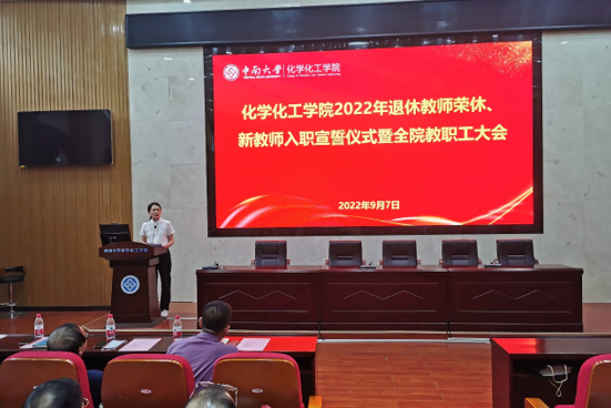 为进一步加强师德师风建设,弘扬尊师重教、崇智尚学的风尚。 9月7日下午三点,化学化工学院在133报告厅首次举行2022年退休教师荣休暨新教师入职宣誓仪式。全体院领导、2022年退休教师、2021-2022年新入职教师、中层干部、教师代表参加了仪式。仪式由学院党委副书记、工会主席刘有才主持。