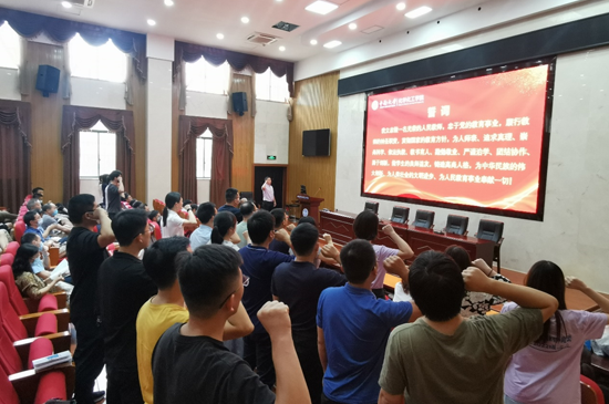 新进教师在领誓人黄铁骑的带领下,齐声朗读誓词,立志做一名光荣的人民教师,忠于党的教育事业,履行教师的神圣职责,贯彻国家的教育方针,为人师表、追求真理、崇尚科学、依法执教、教书育人、勤勉敬业、严谨治学、团结协作、勇于创新,为中华民族的伟大创新、为人类社会的文明进步、为人民教育事业奉献一切!