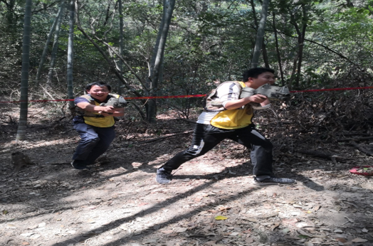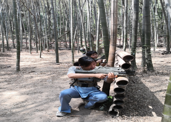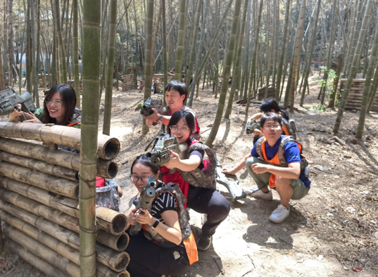 接着,老师们体验了真人CS镭战。四个队伍被并成两个队伍,分别是黄蓝联盟和红橙CP。 “战友们”穿上武装,扛起冲锋枪,在竹林中开展决战。战斗共进行了两轮,异常激烈,老师们忘却了年龄和身份,化身为战士,利用地势和掩体,和队友并肩作战,发起冲锋。