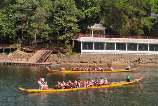 下午,老师们体验了赛龙舟的乐趣。秋高气爽,艳阳高战,波光粼粼的湖面上三只龙舟因老师们的到来变成了在湖水中穿行嬉戏的黄龙。老师们击着行船鼓,喊着劳动号子,齐力挥舞着船桨,给澄净的湖水留下了一道道白色涟漪和一阵阵欢声笑语。