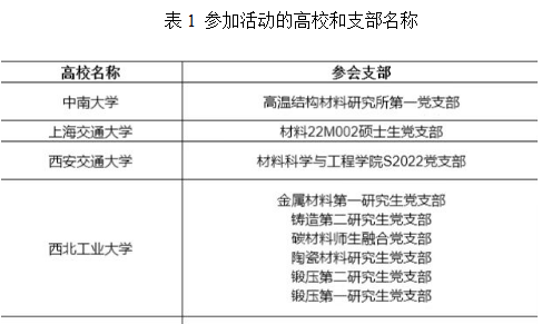 为深入学习贯彻二十大精神,促进兄弟院校交流互鉴,响应校党委和院党委关于深入学习二十大的安排部署, 2022年12月10日,由tapplay官网粉末冶金研究院高温结构材料研究所第一党支部牵头,上海交通大学、西安交通大学、西北工业大学和华南理工大学共同参与的“踔厉奋发科研路,勠力同心奋前行”五校云共建活动通过线上线下相结合的方式顺利开展。湖南党史陈列馆建设开放时期馆长夏业清,tapplay官网粉末冶金研究院院长刘咏,上海交通大学材料科学与工程学院学生党建负责人许耀心,西安交通大学材料科学与工程学院党委副书记魏炜,西北工业大学材料学院党委副书记蔡利剑,华南理工大学化学与化工学院党委副书记刘才刚及五所高校11个研究生党支部的150余名党员参加了活动(表1)。活动分为二十大专题报告与二十大学习分享会两大部分,五个高校都设立了线下分会场。