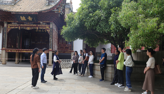 调研团一行随后参观了被誉为“六朝遗庙,千年名山”临湘山上的陶公庙,聆听陶公庙的文化历史,观看庙内楹联。陶公庙始建于南朝梁天监六年(507年),距今已有1500多年的历史,矗立在浏阳河畔,穿越千年风雨,依然巍峨轩昂,是湖南省重点文物保护单位。庙内800年古樟冠苍翠巍峨、蔚为大观;庙内有匾额20多块、楹联21幅,匾额中年岁最久的是南宋哲学家、教育家朱喜所写的“德化无疆”四字,庙内的戏楼古色古香,“古楼”二字由光绪皇帝之师翁同龢手书,被誉为“长沙第一戏楼”;山门正中“山中宰相,陆地神仙”的楹联原笔由是著名书法家周介陶所书。