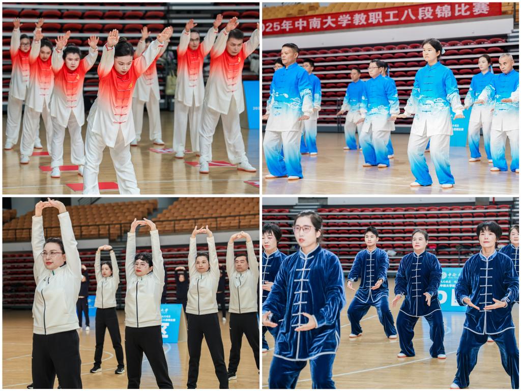 随着悠扬舒缓的音乐响起,比赛正式开始,各参赛队按抽签顺序依次上场。赛场上,队员们神情专注,意气相随,从预备式到“两手托天理三焦”、“左右开弓似射雕”,再到“调理脾胃须单举”、“五劳七伤往后瞧”等八个经典招式,一招一式,有板有眼,动作舒展大方,如行云流水,充分展现了八段锦“意动形随、神形兼备”的独特魅力。有的队伍动作整齐划一,气势恢宏;有的队伍穿着飘逸的太极服,衣袂飘飘,尽显传统武术的神韵;有的队伍编排巧妙,融入了对功法内涵的独特理解与对中南精神的深刻解读......整个比赛过程紧张有序,精彩纷呈,赛场边不时响起阵阵热烈的掌声。
