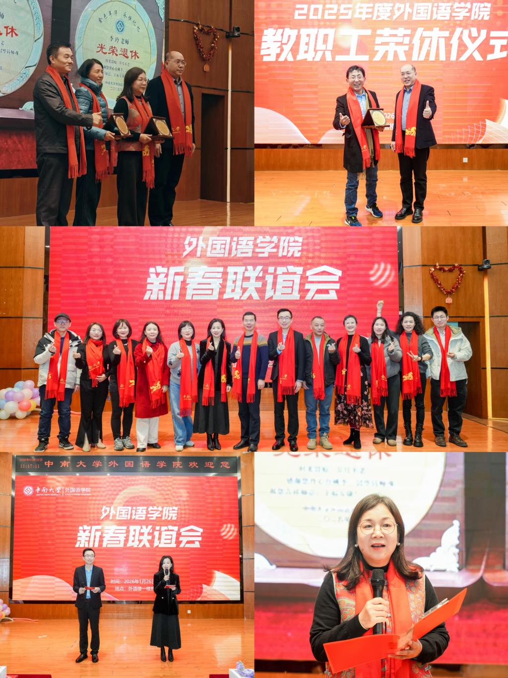 1月26日上午,外国语学院一楼报告厅内张灯结彩、暖意融融,外国语学院2025年度教职工荣休仪式暨新春联谊会在此隆重举行。