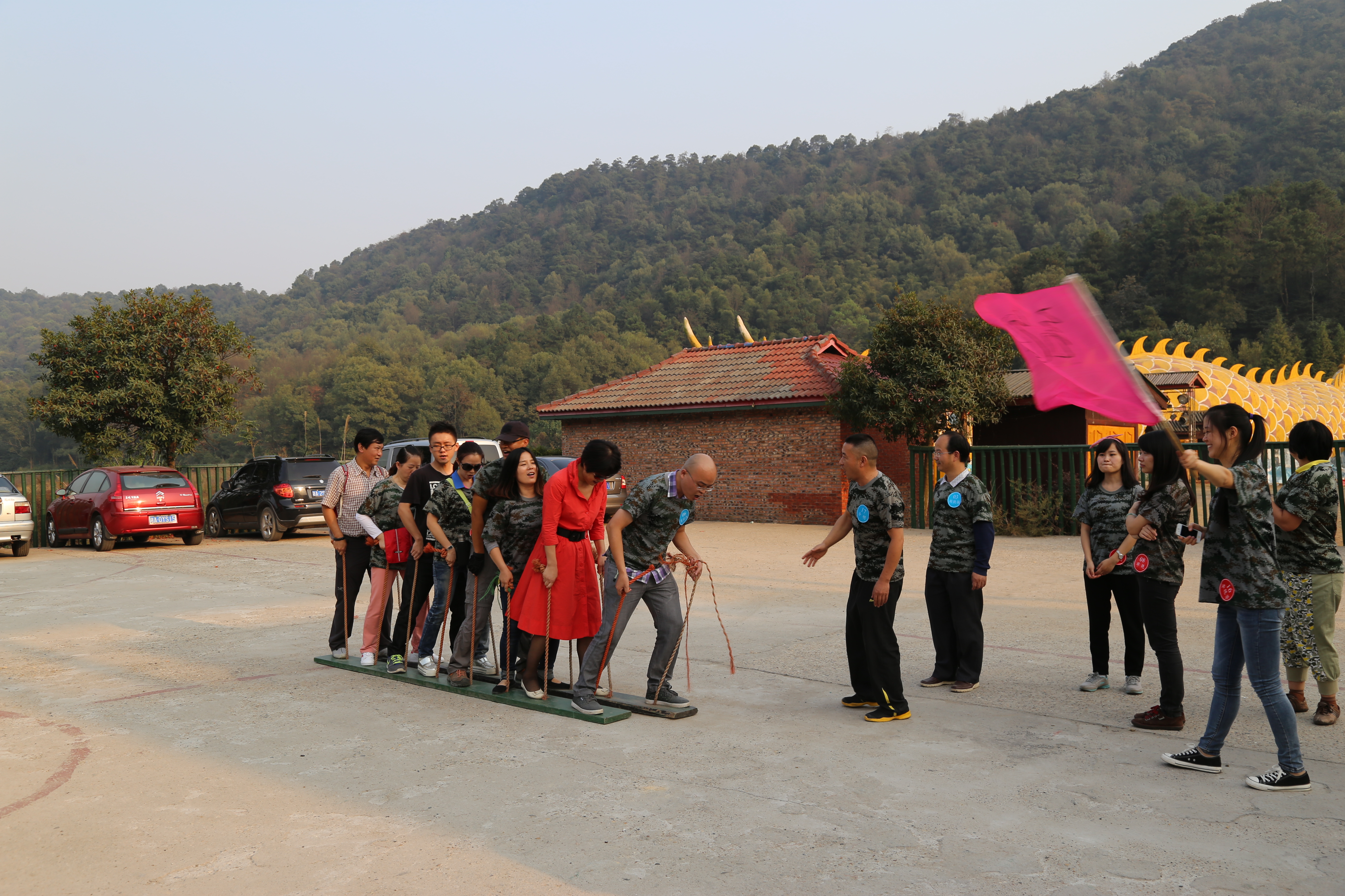 我们队用队长的姓氏命名为“龙之队”,龙队长行事风格果断干脆,迅速指定队蜜、打出“龙行天下”的霸气口号、并改编了《团结就是力量》作为我们的队歌。双方各报山头叫阵时,对方队长一举抢得头筹,响亮喊出 “猛虎队”,并亮明口号“一、二、三、四、五,上山当老虎”。我们队一幽默男士临时起意搞笑,通知大家更改我们原定口号为“一、二、三、四、五,上山打老虎”。情境相融,引得大家哈哈大笑,龙队气势上先声夺人,首先掀起了第一个小高潮!不由领悟到老祖宗兵法上“后发制人”之妙处。