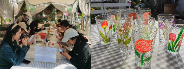 享用完农场别具特色的香草料理后,大家开始了玻璃杯手绘活动。在工作人员的指导下,老师们自信地拿起画笔,调好颜料,勾线,点涂,聚精会神地在小小的玻璃杯上创作起来,郁金香、玫瑰、波斯菊各种花卉在老师们的巧手绘制下,跃然杯上。现场气氛活跃、笑声连连,既亲手体验了手工制作的魅力,又放松了身心、陶冶了情操。