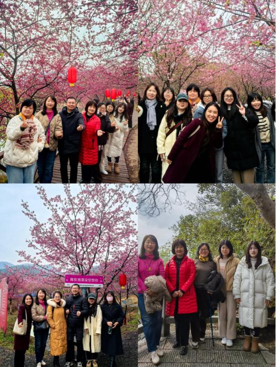 上午10点,大家在潇湘校区外语网络楼门口前坪集合,乘坐大巴车开启了欢乐的旅程。首站抵达的湘潭七星村樱花园宛如一片梦幻的粉色海洋,这里拥有约3000株樱花,红粉佳人、中国红、八重樱、香水樱等南方观赏品种竞相绽放。微风拂过,花瓣如雪般飘落,女职工们漫步其中,或驻足欣赏,或拍照留念,脸上洋溢着幸福的笑容,尽情沉醉在这如诗如画的美景中。