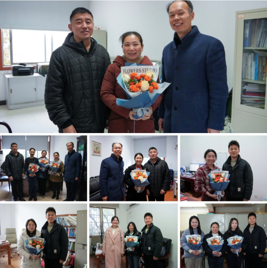 学院党委书记袁世平、副书记李苑代表学院党委、学院工会深入各系所办公室,为辛勤耕耘在教学、科研和管理岗位的女教职工们送上鲜花与节日礼物。芬芳的康乃馨与诚挚的祝福卡片传递着学院对女性教职工的关怀与感谢。收到惊喜的女教职工们纷纷表示,这份仪式感让她们深切感受到集体温暖。
