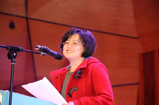 院长李洁一袭红衣,在热烈的掌声中惊艳登场,对2014年工作从教学科研、学科建设等六个方面进行了回顾与总结,她感谢各位成员对学院工作的支持,并向大家致以新年的问候和祝福。