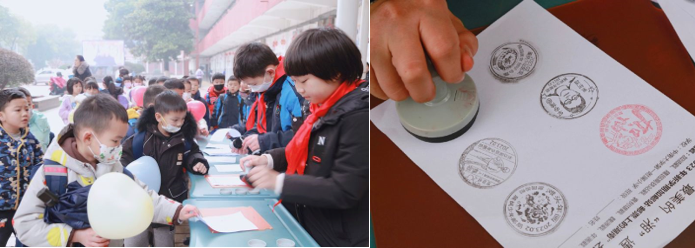 鸣鼓迎新春潮涌,千帆竞发争上“邮”!“咚咚咚!”隆重的鼓声从学校里传来。鼓面是一个大大的邮戳图案——撸起袖子的大手,“加油”、“Cheer up”字样赫然在上。红鼓争“邮”,奋勇拼搏!进入校园报到的孩子们依次到红色的开门鼓前,用力敲击出新学期的添“邮”加彩的美好期待。