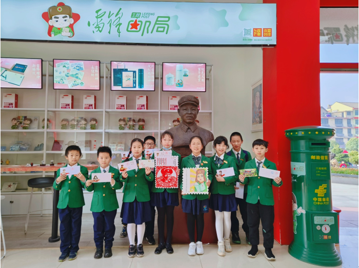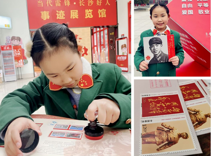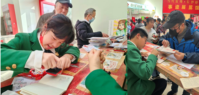 纪念邮戳是邮政部门为配合新邮发行或纪念重大事件、重大节日等而专门刻制使用的一种带有纪念文字或图案的邮戳。“雷锋纪念戳”是麓枫少年邮局文化的一大亮点。在辅导老师带领下,设计团队从初期立意、绘制草图、设计方案确定到最终制作落地,查阅了大量文字及图片资料,重温了雷锋的事迹,深刻把握雷锋精神的时代内涵。近年来,网络顶流平台“小红书”出现大量推文,记录外地网友到长沙麓枫少年邮局打卡,求盖“雷锋戳”的感谢故事,成为新晋“网红城市”长沙的一大现象。麓枫少年邮局用邮戳邮票传承雷锋精神,为集邮文化教育开辟了新的育人沃土。