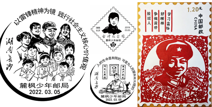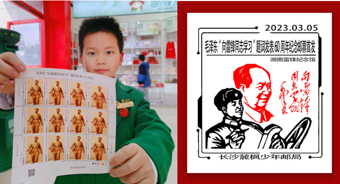 2023年3月5日,中国邮政《毛泽东“向雷锋同志”题词发表60周年》纪念邮票在长沙首发,麓枫少年邮局特制双色纪念戳,助力此次邮票发行。