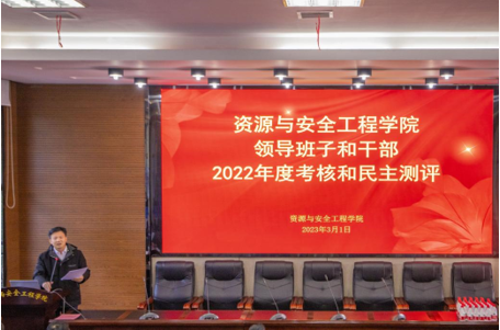 会议议程第一项,由周子龙院长代表资源与安全工程学院领导班子作2022年度述职报告。他在报告中指出在学校党委的正确领导下,2022年学院领导班子以习近平新时代中国特色社会主义思想为指导,顺利完成了学院各项工作任务,推动资安院稳中前进、勇毅前行。在学院的工作总结中,他指出学院注重自身建设,将党建工作和学院发展深度融合,将支部建在学科上,在规范领导班子党风党纪的同时,抓稳学院建设,引领师生党员聚焦学院发展。紧接着,他对上一年学院中心工作所取得的成果做出总结,包括学科建设、教学科研、人才培养、师德师风等多方面的成果。最后,他对学院存在的不足和改进措施做出了详细报告,指明了学院今年努力的方向。