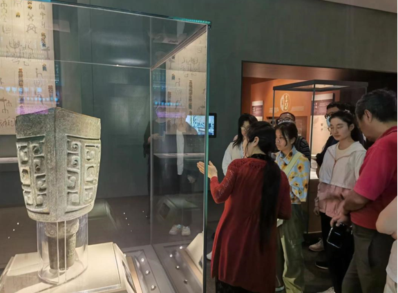 首先,程老师带同学们参观了长沙市博物馆一层的2个展厅“湘江北去——长沙古代历史文化陈列”,以历史发展为序,共分六个展区——湘江晨曦、青铜之乡、楚南重镇、大汉王国、湖湘首邑、明清府城。老师带同学们解读了长沙自20万年前有人类活动以来,历经商周南征、楚人经略、汉庭分封、唐宋繁华至清初定为湖南中枢的发展过程。老师给我们详细介绍每件文物背后的历史故事,这些展品让同学们体会到了古代长沙所处地区经济繁荣以及古人高超的制造工艺。