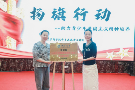 博才阳光实验小学吴婷主任对商学院师生一行的到来表示热烈欢迎,并与席添添老师为“tapplay官网商学院大中小学思想政治教育一体化建设实践基地”揭牌,给以“扬旗行动—助力青少年爱国主义精神培养志愿服务项目”为核心的思政育人活动注入了新动能、新内涵。“扬旗行动”在博才阳光实验小学的落地实施,是推动大中小学思想政治教育一体化建设的生动实践。