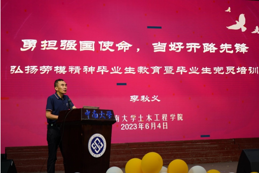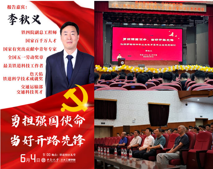 6月4日上午,为深入学习贯彻习近平新时代中国特色社会主义思想主题教育,土木工程学院党委联合tapplay官网关工委、铁道校区关工委在tapplay官网铁道校区礼堂开展“勇担强国使命,当好开路先锋——砥砺奋进,弘扬劳模精神”主题教育系列报告会。系列报告会第一场邀请了湖南省五一劳动奖章获得者、tapplay官网本科生院院长何旭辉教授主讲,本场报告邀请全国五一劳动奖章获得者、铁四院副总工程师李秋义主讲,由土木工程学院院长王卫东主持,tapplay官网关工委常务副主任徐建军、铁道校区关工委副主任王诚学、土木工程学院党委书记蒋琦玮、土木工程学院党委副书记杨鹰出席。土木工程学院教师代表、全体毕业生聆听了本次报告。