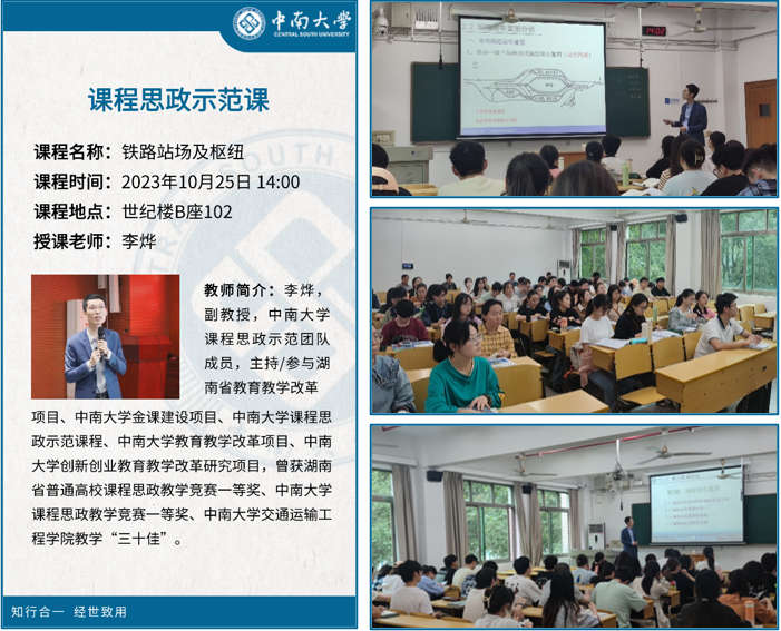 为深入贯彻落实习近平总书记关于教育的重要论述和全国教育大会精神,教育部《高等学校课程思政建设指导纲要》、《全面推进“大思政课”建设的工作方案》等文件精神,充分发挥学院课程思政教学研究中心的主体作用,提高人才培养质量,10月25日,交通院课程思政教研中心在铁道校区世纪楼B座102,举办了一次课程思政示范课活动。