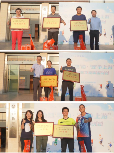 谢群书记主持颁奖典礼,最终,光电系、电子系荣获一等奖;双超所、大物中心荣获优秀组织奖;物理系、量子物理研究所、办公室荣获“最佳风采奖”。副院长龙孟秋、阳军亮、孙佳为获奖单位颁奖。至此,学院第一届教职工趣味运动会圆满结束。