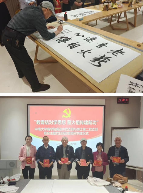 最后,开展老青党员结对互动。杨伟文教授和李自如教授现场进行书法展示,与会党员认真观摩,共同领略中华传统文化的博大精深。杨伟文教授特地为本次支部共建活动写下“老青连心 薪火相传”的书法留存,象征两个支部的共建情谊。博士第二党支部也派代表向离退休党支部各位老党员同志赠送了亲手制作的爱国钉子绕线画,表达对离退休党员的感激和敬佩之情。现场氛围热烈,亲切而温馨,老青党员两代党员交流效果良好。