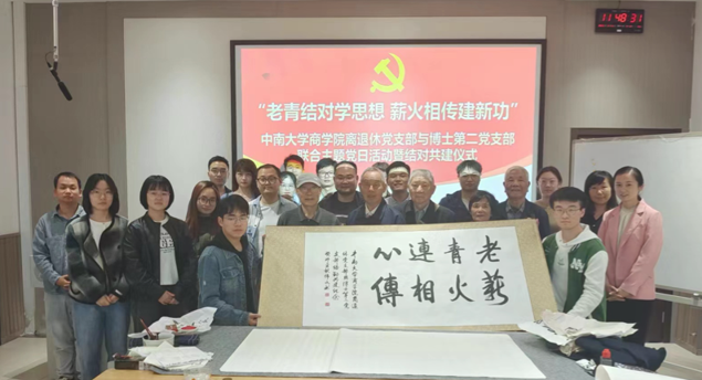 10月26日上午,在tapplay官网商学院党委的指导下,tapplay官网商学院离退休党支部与博士第二党支部在江湾楼205活动室联合开展“老青结对学思想 薪火相传建新功”主题党日活动暨结对共建仪式。会议由博士第二党支部书记朱赛主持,离退休党支部5名老党员同志、支部党建指导员汪进贤副教授、党办周玲老师及博士第二党支部30余名博士研究生共同参加了本次活动。