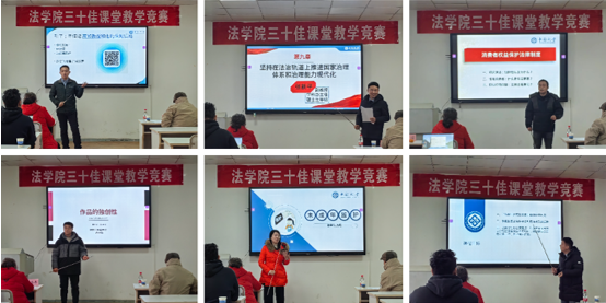 为深入落实立德树人根本任务,进一步激发教学人员夯实教学基本功、创新教学理念和掌握现代教学方法的热情,切实提升课堂教学质量,充分发挥课堂教学育人“主渠道”作用,法学院课程思政教学研究中心和法学院工会联合举办了2023年“三十佳”课堂教学竞赛活动。本次教学比赛分为初赛和决赛两个环节:初赛环节,参赛教师提交一份教学设计和课件,专家评审后选出优秀选手进入决赛。本次共有8位教师进入决赛,决赛于12月20日下午在文法楼410举行。学院邀请了本科生院教学督导李满春教授、戴端教授、吴玲英教授、胡凯教授,陈立新副教授担任专家评委。此次教学竞赛由法学院党委副书记刘勇主持。