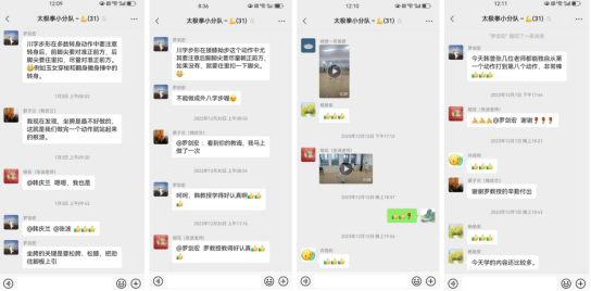 罗剑宏教授满腔热情地投入到了太极拳培训班的组织和教学中。培训班在每周二下午进行集中学习。罗教授曾经荣获多项国家级大赛优秀指导教师奖和校教学质量优秀瓷,他把教学的经验和热情用到了太极拳的教学过程中。在上课前,他进行积极的备课,并提醒大家在课前先复习上次上课的动作及要领。在课堂中,罗教授更是一招一式耐心讲解,对一些关键性的动作要领更是反复示范,确保每位老师都能得到悉心指导,都能准确地把握动作的精髓。在课后,他还会把新学招式的动作要领以文字、图片、视频等方式在群里分享给大家,并进一步分享自己的练功心得,及时答疑大家的问题,鼓励大家坚持练拳。通过罗教授的线下授课和线上互动,培训班形成了良好的习拳氛围。