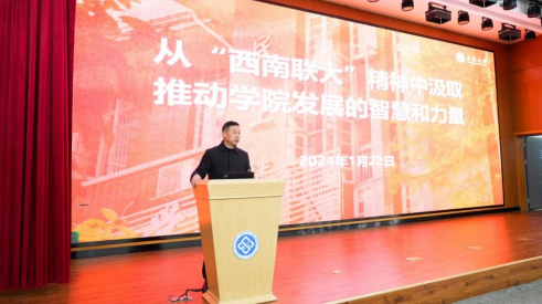 党委书记易险峰做大会总结发言。他以“从‘西南联大’精神中汲取推动学院发展的智慧和力量”为题,通过讲述联大的历史变迁,阐述联大“刚毅坚卓”的精神内涵,就学院学科建设中部分指标同兄弟高校学院的差距,指出制约学院发展亟待破解的难题。希望全体师生赓续传承联大精神,坚持落实立德树人根本任务。一是教师要把主要精力聚焦于教育教学。在人才培养的过程中,融入因材施教的智慧和有教无类的情怀,把对学生的全面培养作为第一要务。教师不仅要做科学家,更要做躬耕教坛,放眼长远的教育家。二是要以控制学科为依托,做有效果有组织有人文的科研。希望年轻教师要耐住性子,挨住寂寞,以更高站位脚踏实地做好基础研究。三是要营造“包容和合、担当进取”的文化氛围,拓展开放活跃的创新空间,创造便利舒适的教学科研条件,让老师们快乐工作,幸福生活。