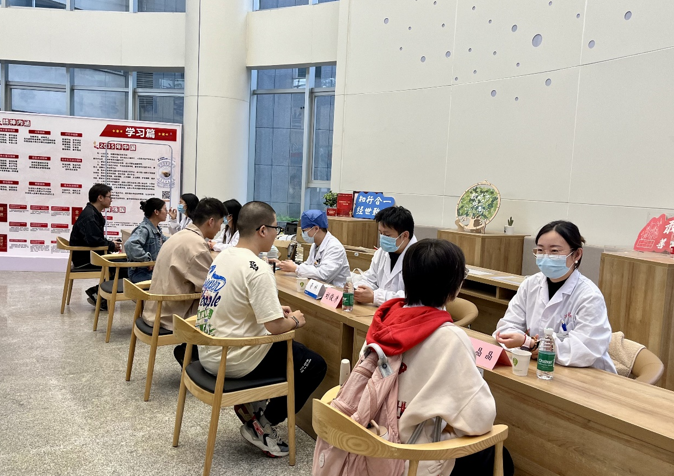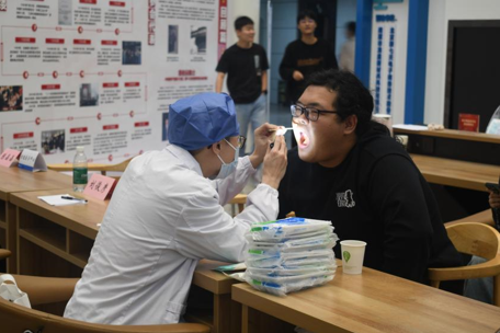 义诊过程中,各医学生面前都排起长队,郭博士和楚博士耐心解答同学、老师们提出的如何祛痘等问题,讲明可能的原因以及生活习惯上的注意事项;姚博士时常起身用医用手电查看问诊同学口腔情况,随后在纸上勾画,以通俗易懂的方式解释病灶来源;刘博士、陈博士倾听同学的讲述,在细致询问后给出建议。同学们在起身离开时不约而同向前来进行义诊的医学生们表达谢意。