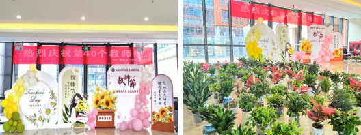 活动现场,精心准备的教师节背景墙营造出了浓厚的节日氛围,既温馨又充满生机。活动中,同学们为每一位老师送上不同种类的绿植盆栽,并致以诚挚的教师节祝福。