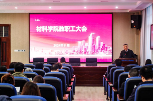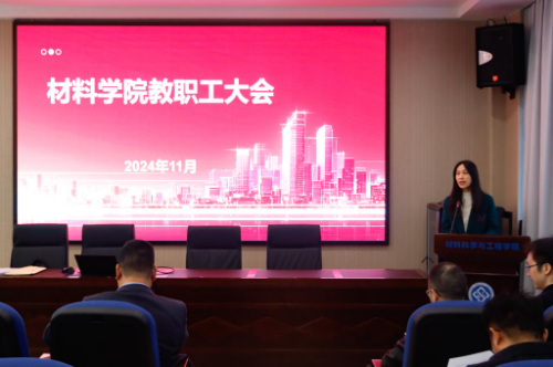 11月21日下午,材料科学与工程学院在化学楼210会议室隆重召开全体教职工大会,会议由学院党委书记王新平主持,全体院领导及教职工出席了此次会议。
