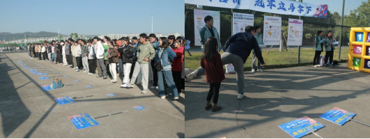 “旋风跑”,算得上最为刺激的项目了,选手们需要接受“离心力”的考验,全员绕桩360°,内圈的同学要拉紧外圈的同学保证他们不被甩飞,外圈的同学要紧靠内圈的同学确保自己不掉队。小小的游戏,展现了互相帮助,克服一切阻力向前冲的优秀作风。