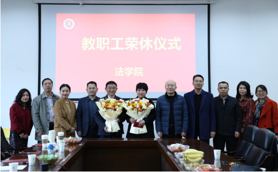 1月17日,学院在文法楼210会议室召开退休教师荣休欢送会。会议由李华东书记主持,退休教师余卫明教授和梁小尹老师应邀出席,许中缘院长、刘勇副书记、何炼红副院长、杨清望副院长、彭中礼副院长,民商法所所长龚博、国际法所所长邓婷婷等教师代表参加。