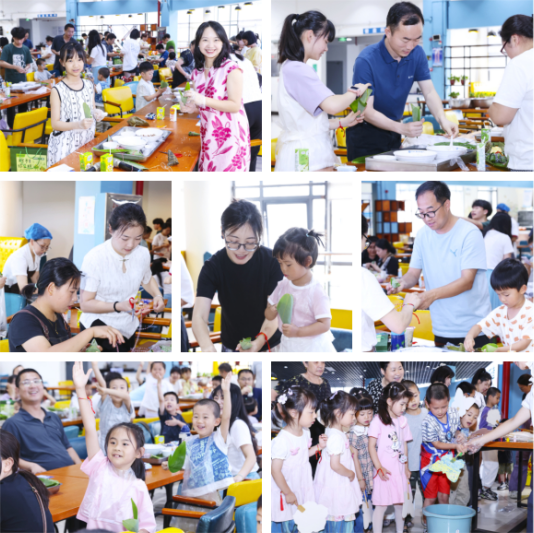 转入手作环节,食堂瞬间变身创意工坊。食堂工作人员介绍完粽子包法之后,大家已经迫不及待上手操作了。在糯米与蜜枣的甜香中,新手爸妈们带着孩子将粽叶卷成小斗,塞入晶莹米粒,再用彩色丝线缠绕出憨态可掬的三角粽;整个食堂的欢声笑语此起彼伏。最热闹的当属于彩绘区和漆扇DIY区了,孩子们翘首以盼的等待扇子变幻出绚丽色彩的一刻,激动的手舞足蹈。